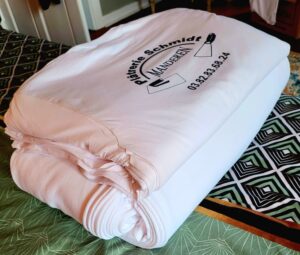 Ce bavoir comme vous pouvez le voir ci-contre à été réalisé sur mesure pour un monsieur éprouvant des difficultés à s’alimenter proprement mais qui souhaitait rester présentable auprès de sa famille et au restaurant.